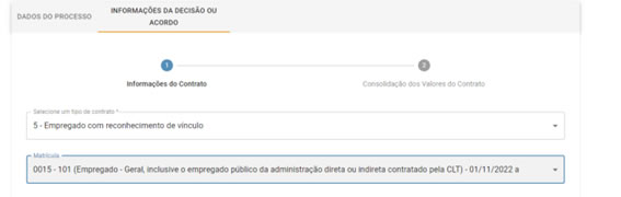 Seguir as orientações constantes no item Dados do processo deste manual. Na aba “Informações da decisão ou acordo”, deve ser selecionada a opção “5 – Empregado com reconhecimento de vínculo”, e selecionar a matrícula informada na admissão: